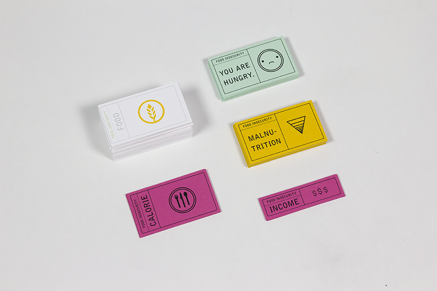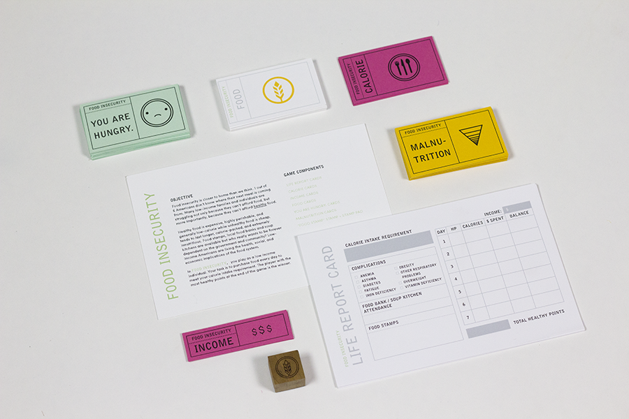 Food insecurity is closer to home than we think. Food Insecurity is a game in response to hunger in America. In the game, players each take the role of a low income individual. Their task is to purchase food (in the form of cards) every day (each round) to meet their calorie intake requirement. The player with the most healthy points at the end of the game is the winner.